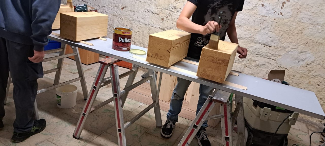 Einmal in der Woche haben sich die Schüler getroffen und die Bänke gebaut. Das Holz musste zunächst gewässert, dann geschliffen und geölt werden.