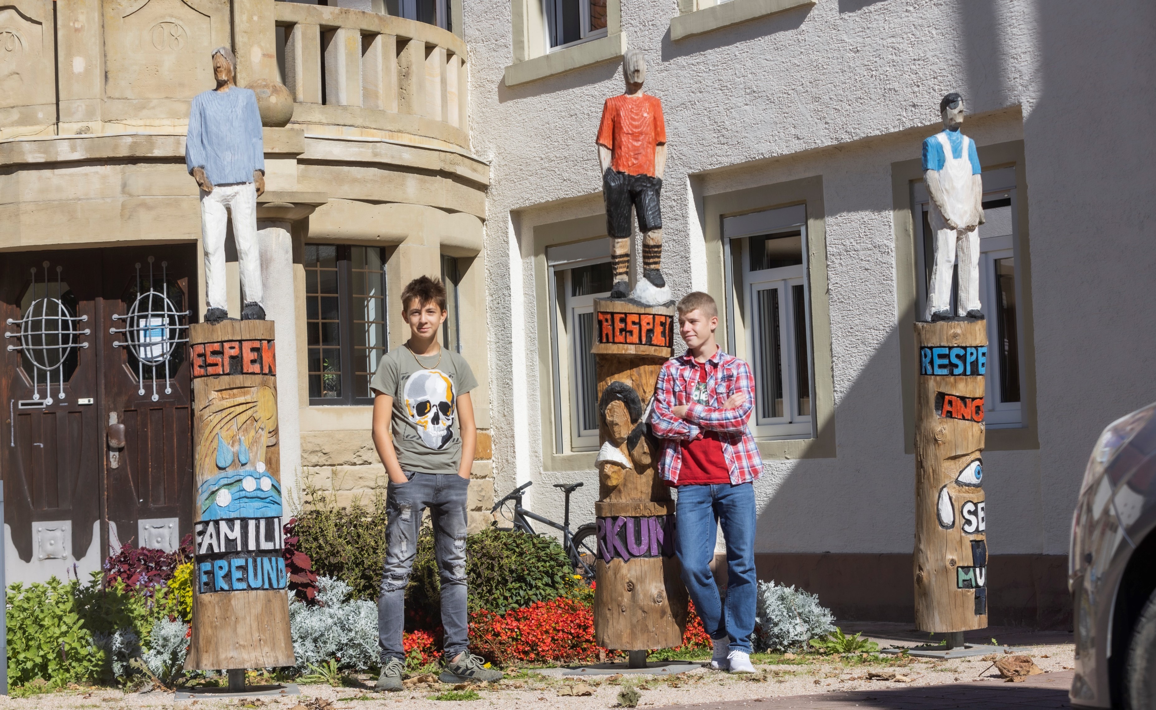 „Respekt!“ wurde 2008 gefertigt - bei den Jugendlichen im St. Augustinusheim ein gern genutzter Ausdruck der Anerkennung. Dabei bleibt er nicht nur so dahingesagt. In Zusammenarbeit mit dem Künstler Rudi Bannwarth haben die Jugendlichen drei Holzstelen angefertigt, die gleich mehrere Inhalte transportieren sollen: Sie zeigen in der Farbigkeit der Menschen auf den Stelen die Unterschiedlichkeit aller Menschen auf der Welt. Außerdem symbolisieren sie zugleich den Respekt, den man dem anderen im Beruf, in der Familie und im Freundeskreis entgegenbringen muss – auch wenn mal Angst und Zweifel sich daruntermischen sollten.
