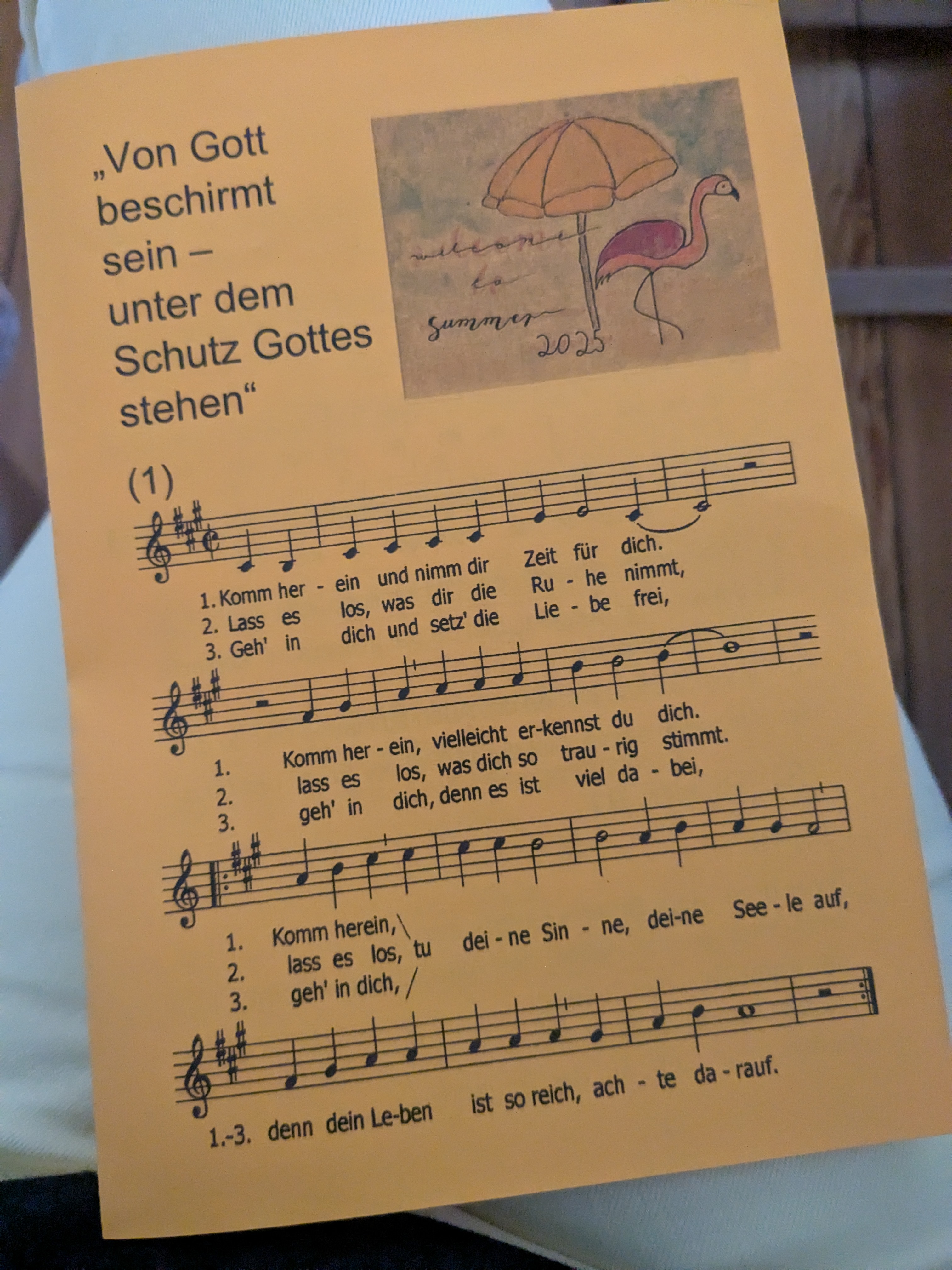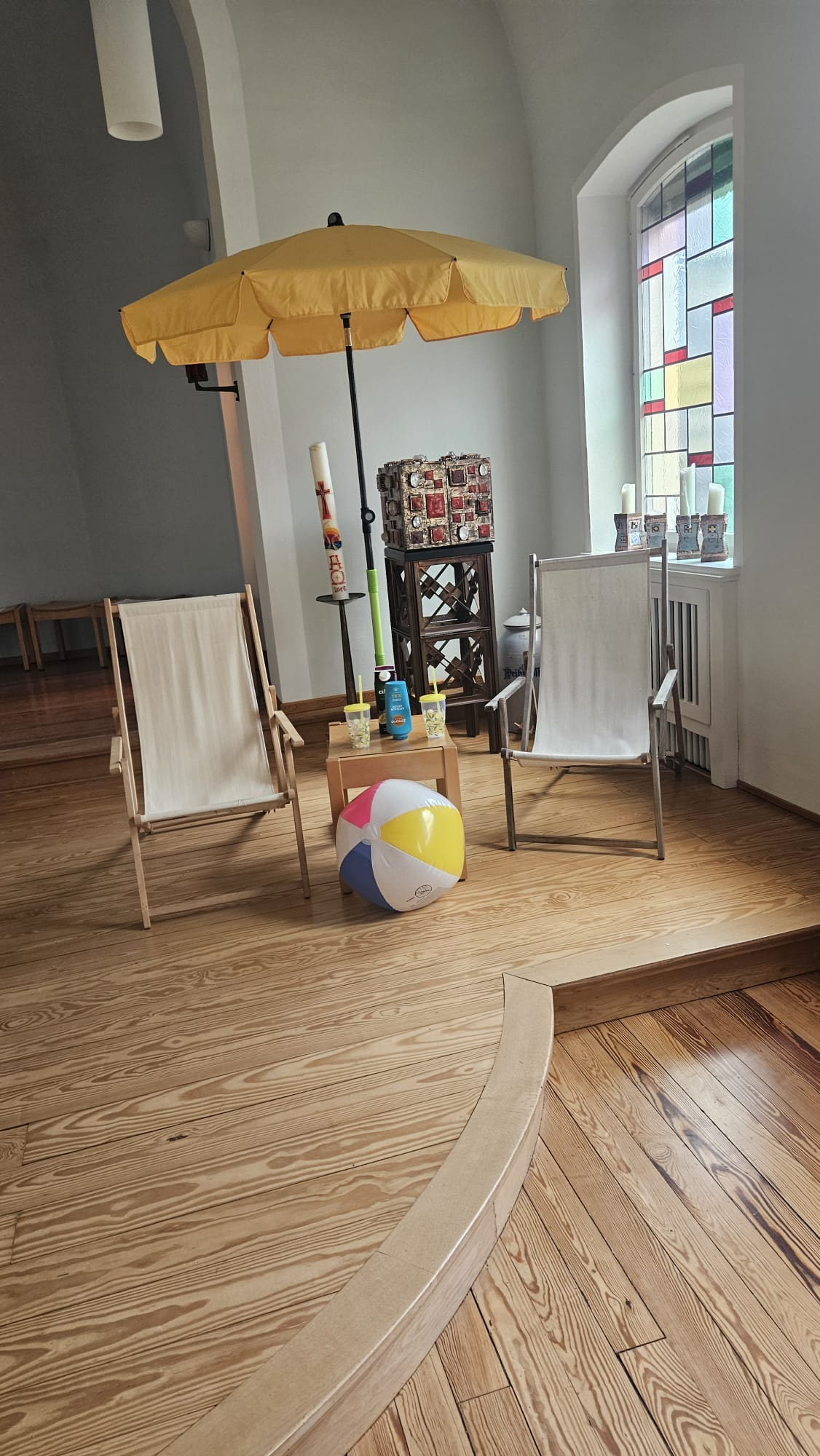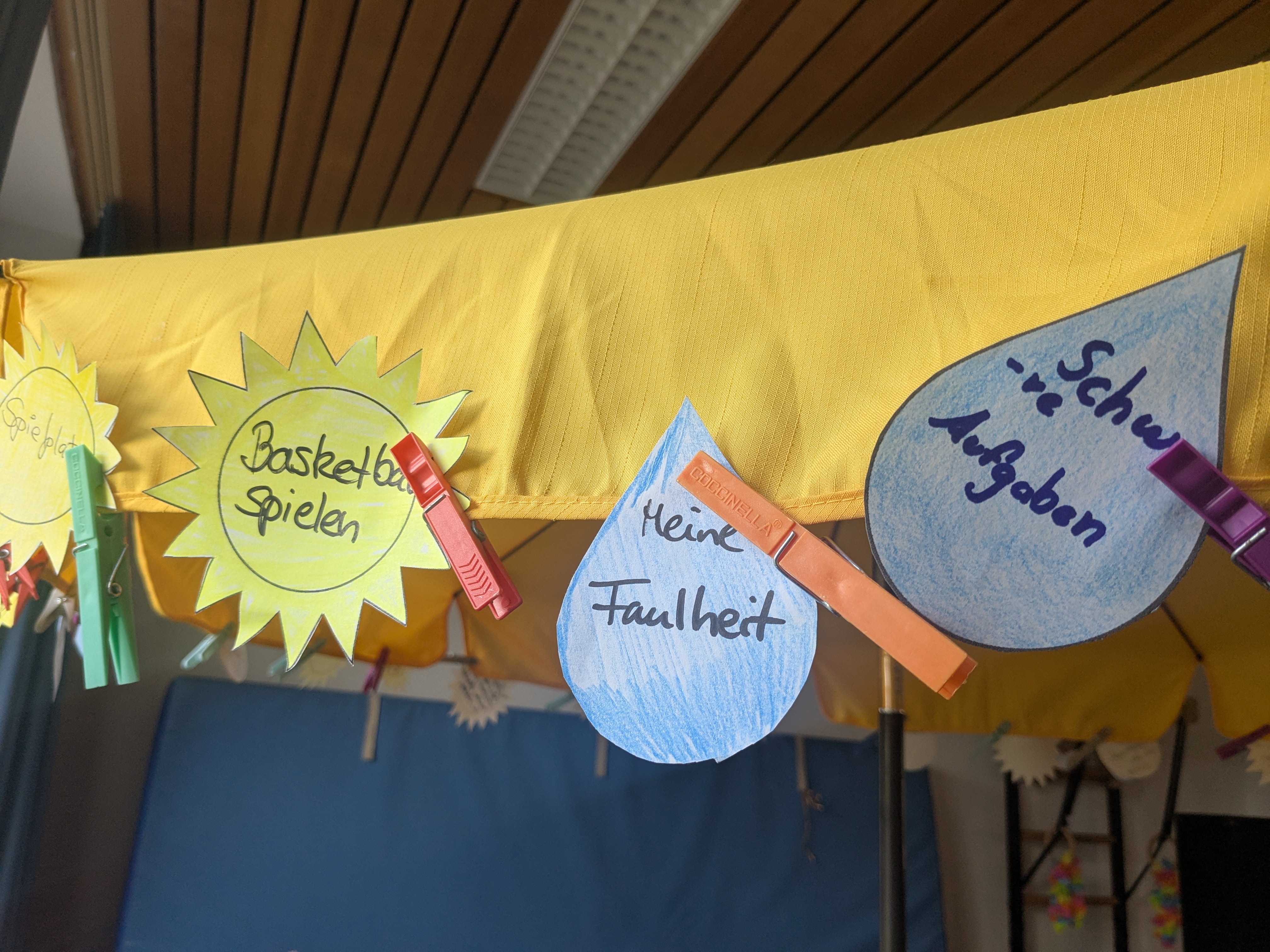 Mit einem Gottesdienst wurde das Abschlussfest eingeleitet. Zum Thema „Von Gott beschirmt sein unterm Schutz Gottes stehen“ haben Pfarrerin Braun und Pfarrer Woschek die Mitarbeitenden und Jungen Menschen in der Kapelle des St. Franziskusheim auf den Vormittag eingestimmt. Beim gemeinsamen Gottesdienst gestalteten auch diesmal die Mädchen und Lehrer_inen aktiv das Geschehen mit. Im Mittelpunkt stand ein gelber Sonnenschirm, an dem Regentropfen und Sonnenstrahlen aufgehängt wurden – als Sinnbild für die Höhen und Tiefen, die ein Jahr mit sich bringt.