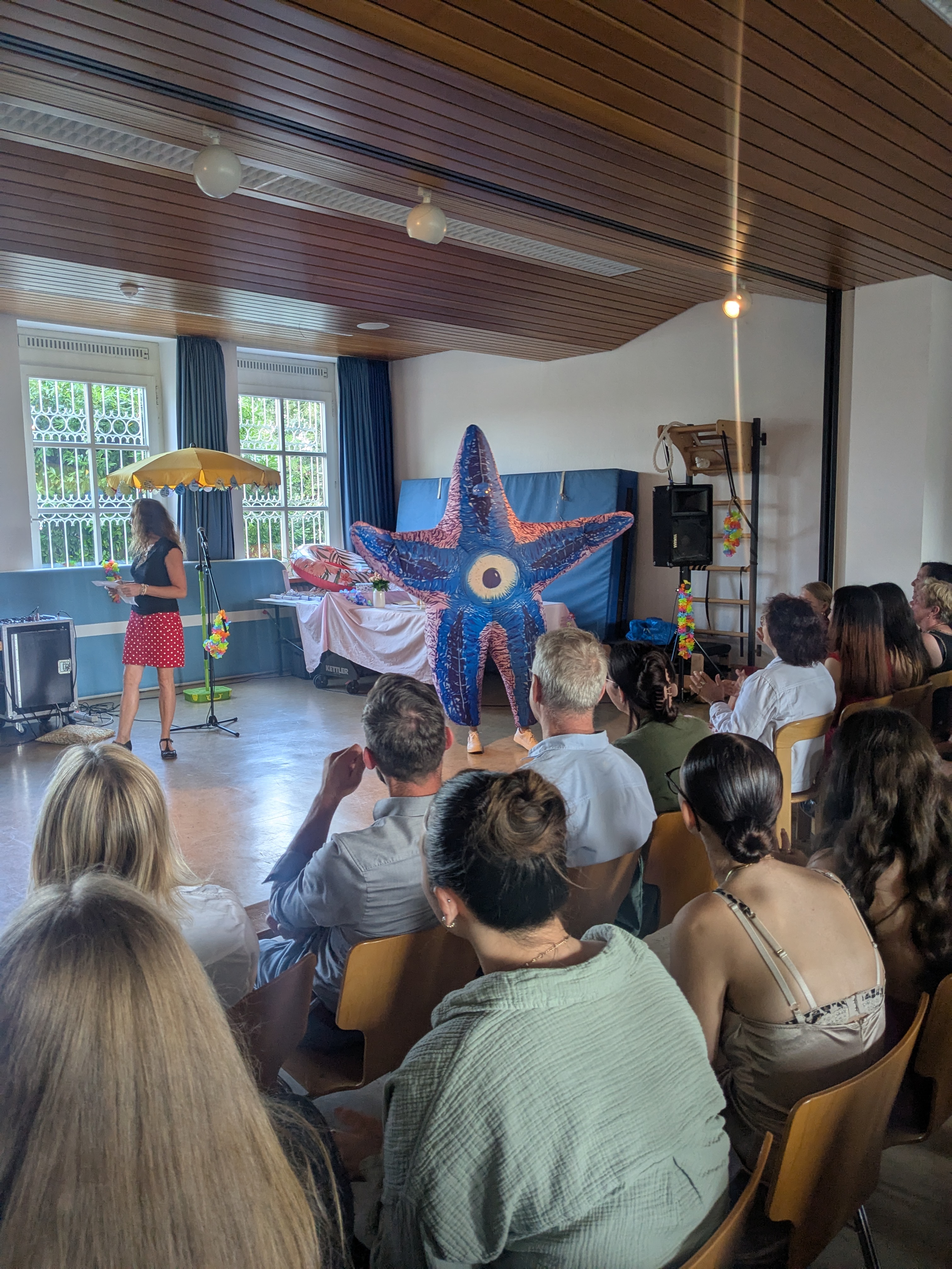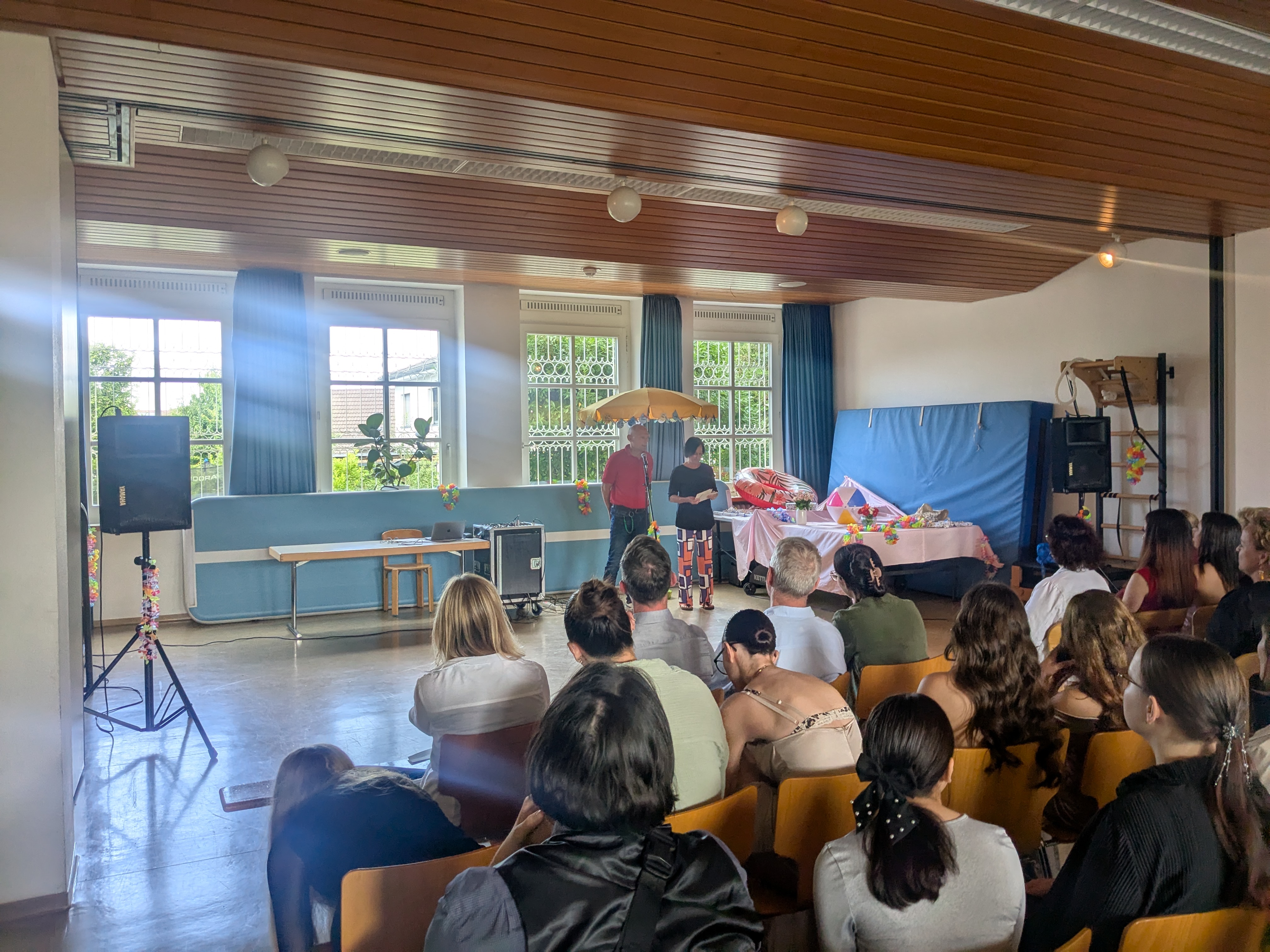 Anschließend ging es – da das Wetter nicht ganz zum Thema passte - in den Mehrzweckraum. Unter dem Motto "Sommer Sonne Sonnenschein" begrüßte der Geschäftsführer Stefan Krehl alle Gäste, Mitarbeitenden und Schüler_innen und gratulierte allen Schüler_innen zum erfolgreichen Schuljahr. Die Mädchen der Abschlussklasse führten einen Tanz zu dem Song „Can't Stop the Feeling! von Justin Timberlake auf.